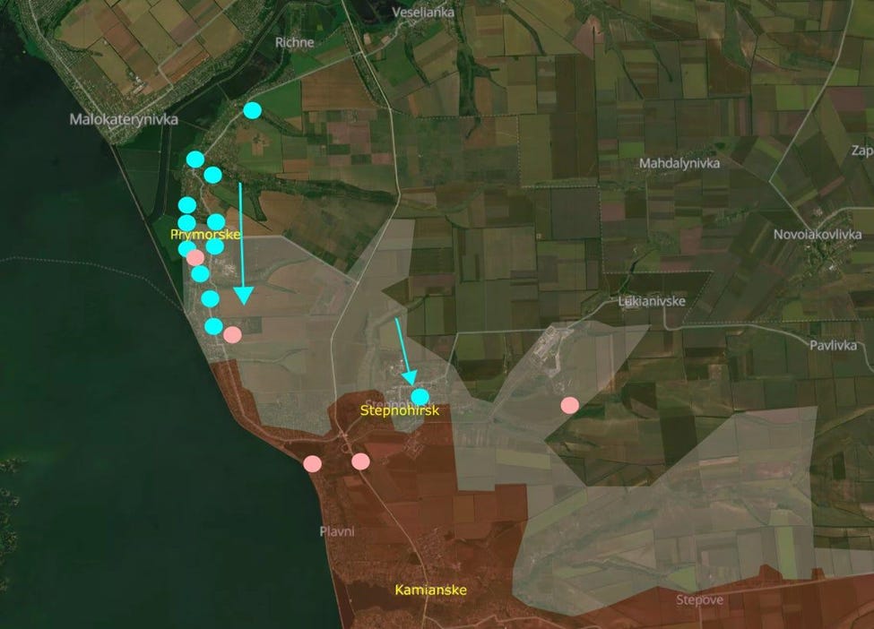 Ukraine clears Prymorske and continues to press south.
