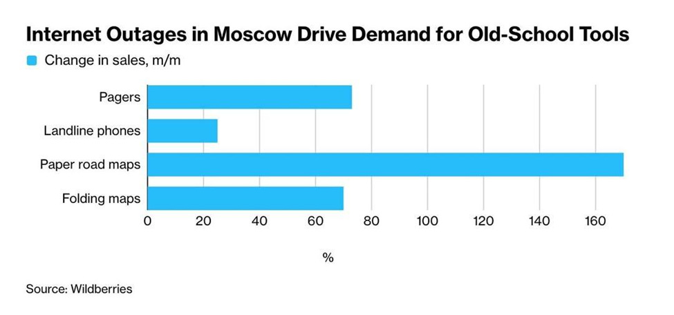The internet in Moscow has been shut down for more than a week for security reasons. Sales of pagers, paper maps, walkie-talkies and telephone landlines have increased. Business losses could be $12.5 million a day.