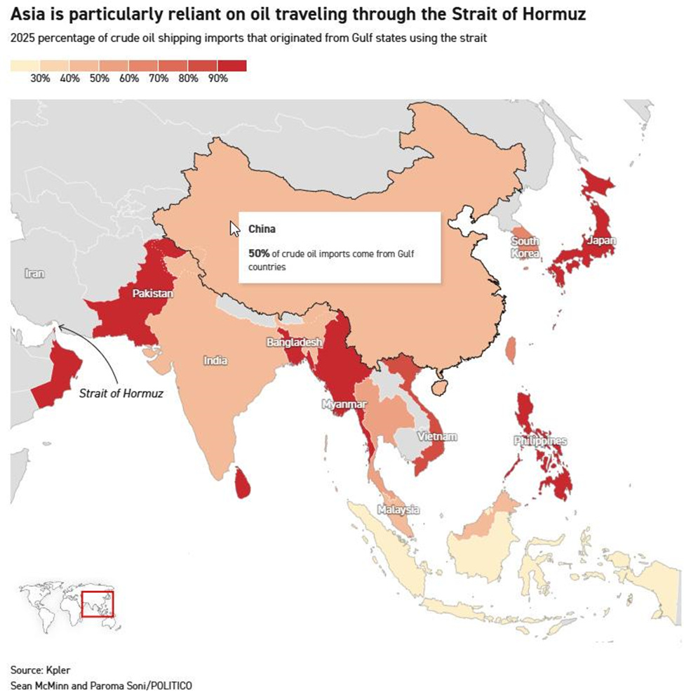 China is the world’s second largest consumer of oil behind the US, and the world’s largest importer of oil. China imported a record amount of oil in 2025 to build up its reserves. Iran sent 87% of its oil to China and Venezuela sent 55% to them. That amount represented 13.5% and 3.8% of China’s imports, respectively. After the US/Israeli attack on Iran last June, China continued to buy cheaper Iranian oil but began diversifying its sources. Overall, China relies on oil for 18.2% of their energy needs and 70% of the oil it uses comes from imports. If it continues to consume oil at the 2025 levels it has enough reserves for 104 days.