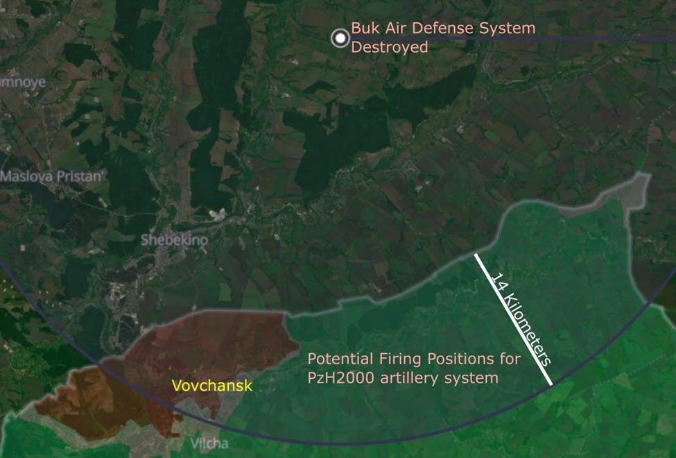 A Buk air defense system was destroyed in Belgorod with what appears to be a BONUS 155 mm shell. The round was designed to destroy tanks. The BONUS round with base bleed (see below) has a timed fuse ejects two submunitions over the target area. Each submunition has winglets that spins the round as it descends. While spinning, it uses IR and LIDAR sensors to spot a vehicle. Once a vehicle is detected, the submunition fires an explosively formed projectile (a kind of a shaped charge) that penetrates the weak top armor of a vehicle. Two different targets can be potentially hit, as seen here in a demonstration video.