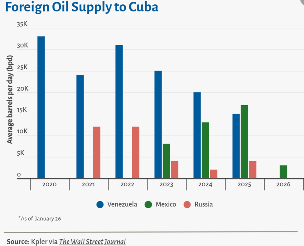 The dollar was worth 64 Cuban pesos in July 2021. It’s now worth 460 Cuban pesos. Cuba’s exports fell from $1.6 billion to $994 million in 2024. It’s GDP fell from $91 billion in 2016 to $12 billion in 2024. Tourism is the government’s main source of foeign exchange and has dropped 70% since 2018. Dependent on oil from Venezuela, Russia and Mexico, Trump cut off the Venezuelan source. Trump pressured Mexico to stop sending oil. Mexico’s state oil company said it intended to uphold its contract with Cuba, but Mexico’s president canceled January’s shipment to Cuba and said they would send other types of aid instead. Russia said they will continue to send oil. If true, it will be another potential conflict between Trump and Putin. Cuba imports 60% of the oil it consumes and uses fuel oil to generate electricity. The fuel shortage resulted in 20-hour blackouts in many parts of the country, impacting refrigeration of food and medicine. Cuba may have less than 20 days of fuel left.
