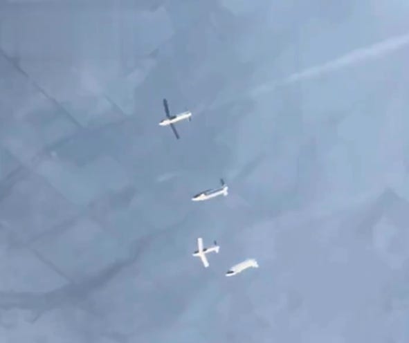 A still from a video showing four UMPB-5s powering up, about a second after their release from a Su-34 (notably, two have their wings out and motors burning; the other two are yet to follow in fashion):